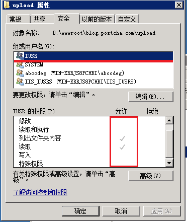 一般的网站都有上传文件、图片功能,而用户上传的文件都是不可信的。所以还要对上传目录作单独设置。上传目录还需要给IIS_IUSRS组再添加“修改”、“写入”权限。